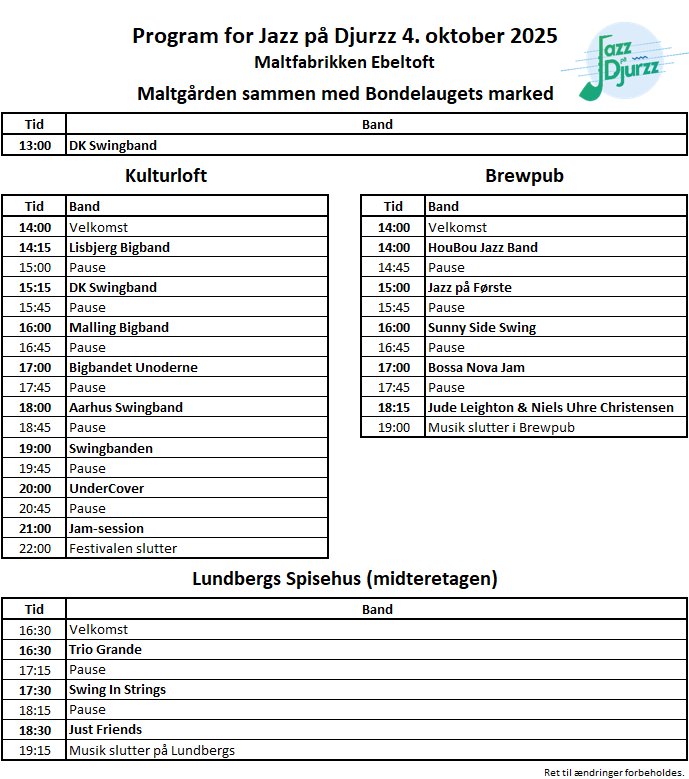 Vi spiller på tre scener: Big Bands spiller på Kulturloft. De mindre orkestre spiller på BrewPub og Lundbergs Spisehus.